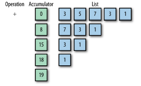 폴드 또는 리듀스는 언어들 사이에서도 이름이 다양하고 조금씩 의미도 다릅니다. 이 작업은 연산(operation)과 누산기(accumulator)를 가지고 컬렉션에 있는 값을 처리해 더 작은 컬렉션이나 단일 값을 만드는 작업입니다. 그림은 목록에 있는 값을 모두 더하는 작업입니다. 여기 누산기에 초기 값이 있는 경우도 있습니다.